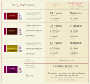 Además, tal como dijimos antes, estos tres tipos de vino se categorizan según su envejecimeinto como se estableció en 1982, aunque con actualizaciones y modificaciones que han dado lugar al sistema actual de etiquetas y contretiquetas.